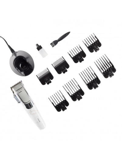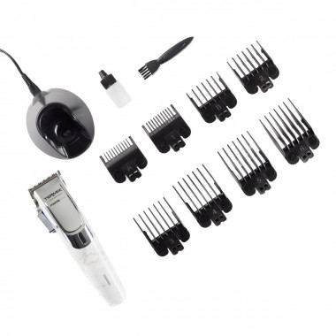 Set de 8 peines, cepillo de limpieza, base de carga para dejar tu máquina cargando, aceite para engrasar la cuchilla y un cargador con cable que te permite usar la máquina mientras se carga.