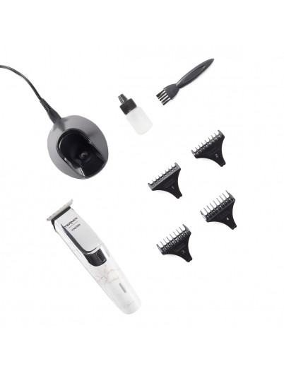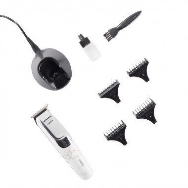 Set de 4 peines, cepillo de limpieza, base de carga para dejar tu máquina cargando, aceite para engrasar la cuchilla y un cargador con cable que te permite usar la máquina mientras se carga.