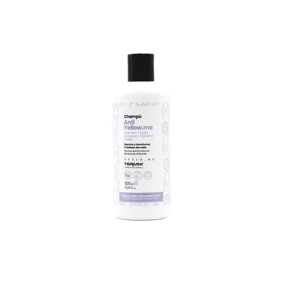 - Champú matizador con extracto de aceite de Marula, aloe vera y pigmento violeta