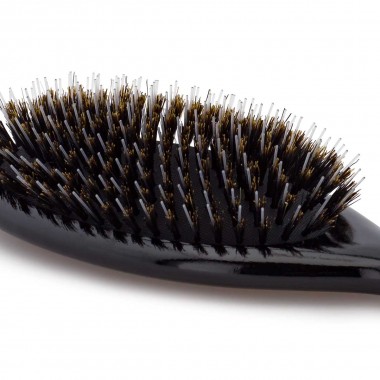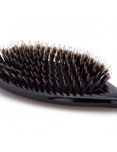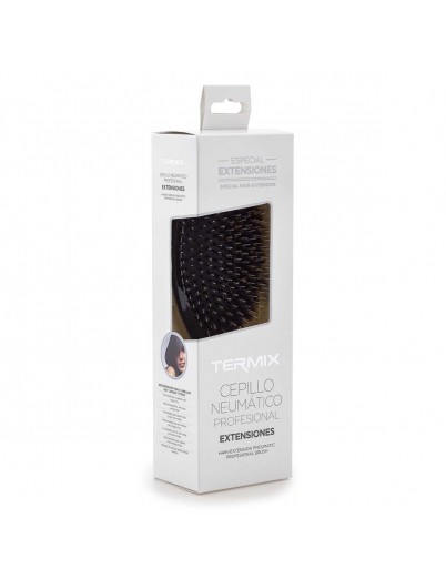 Cepillo neumático que incorpora una mezcla de fibras naturales de jabalí con nylon flexible que permiten el cepillado en seco de cabellos con extensiones, sin dañar su unión o fijación en ningún momento