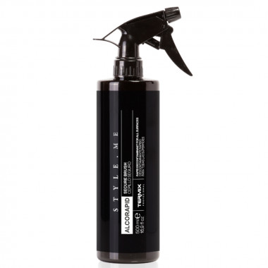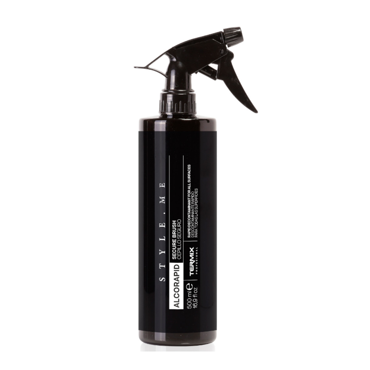 Alcorapid Cepillo Seguro es una solución alcohólica con un complejo antibacterial para la higiene de herramientas de peluquería (cepillos, peines, tijeras...), mobiliario y superficies de salón.